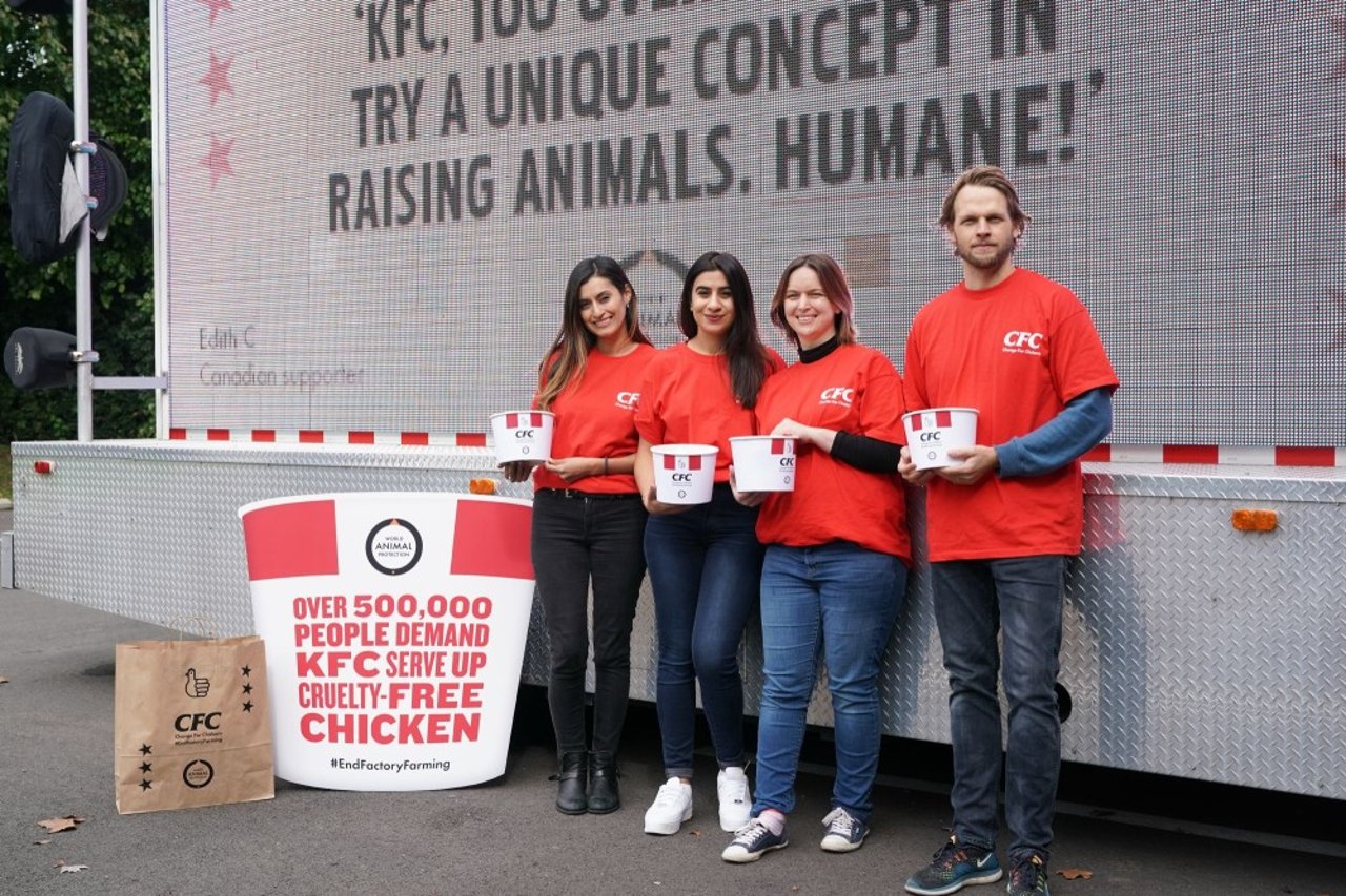 Hoofd van onze wereldwijde kippencampagne Jonty Whittleton zegt: 'Kippen zijn het belangrijkste ingrediënt voor dit wereldwijde multimiljardair bedrijf, maar ze worden beroofd van hun meest basale behoeften en worden onderworpen aan een leven van ellende en pijn. Een enorme hoeveelheid supporters is het met ons eens: genoeg is genoeg. We zullen ons blijven inzetten om bij KFC en andere bedrijven om een einde te maken aan deze hartverscheurende wreedheid. Onze supporters staan vlak achter ons, bij elke stap.'