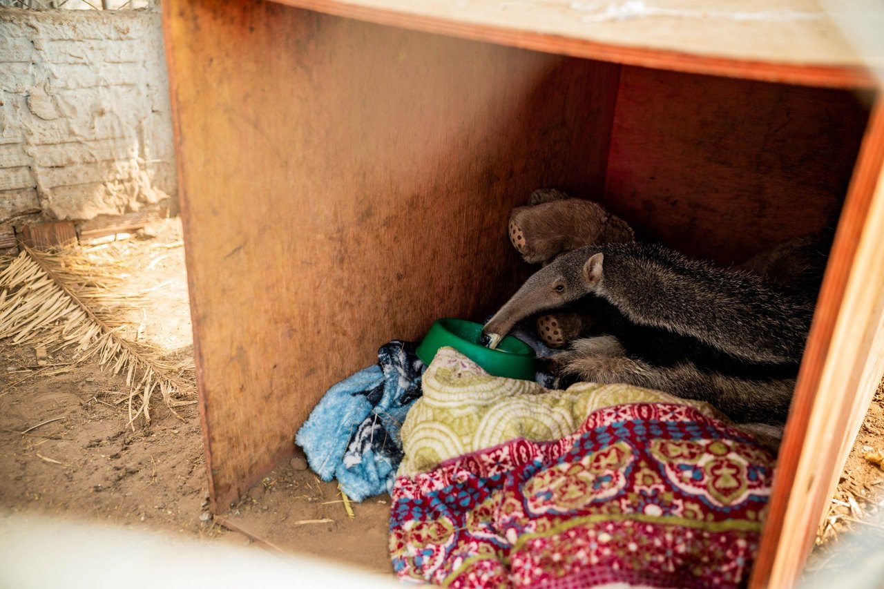 De opgevangen reuzenmiereneters krijgen voedsel en water om te herstellen.